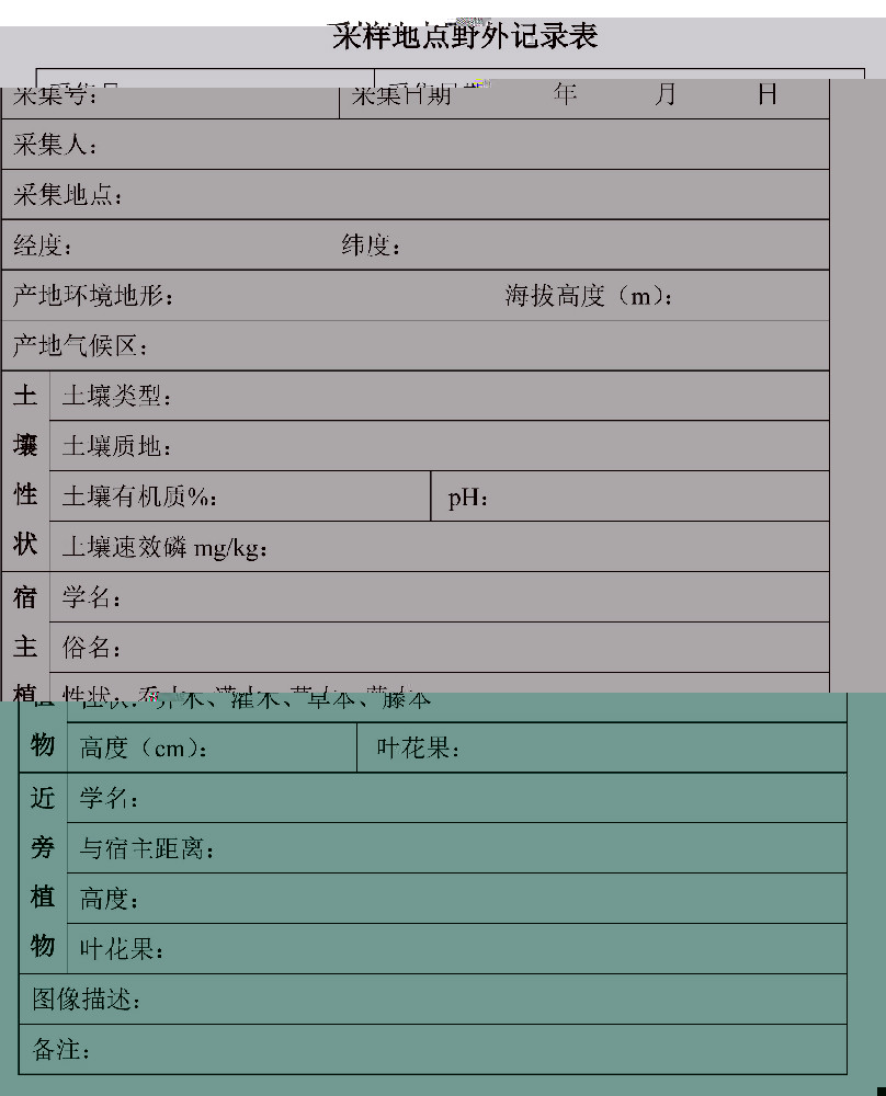 準備需要的采樣工具 (一次性無菌PE手套、小鐵鍬、消毒濕紙巾、剪刀和枝剪、塑料自封袋、标簽紙、鉛筆、記号筆、布袋、照相機、采樣記錄本、GPS等),根據采樣目的選擇調查地點、樣點和長勢良好的寄主植物,記錄調查地點的行政區劃名稱、地理坐标、地形、植被、土壤類型、土壤質地、寄主植物名稱及生長狀況等,并對生境拍照。