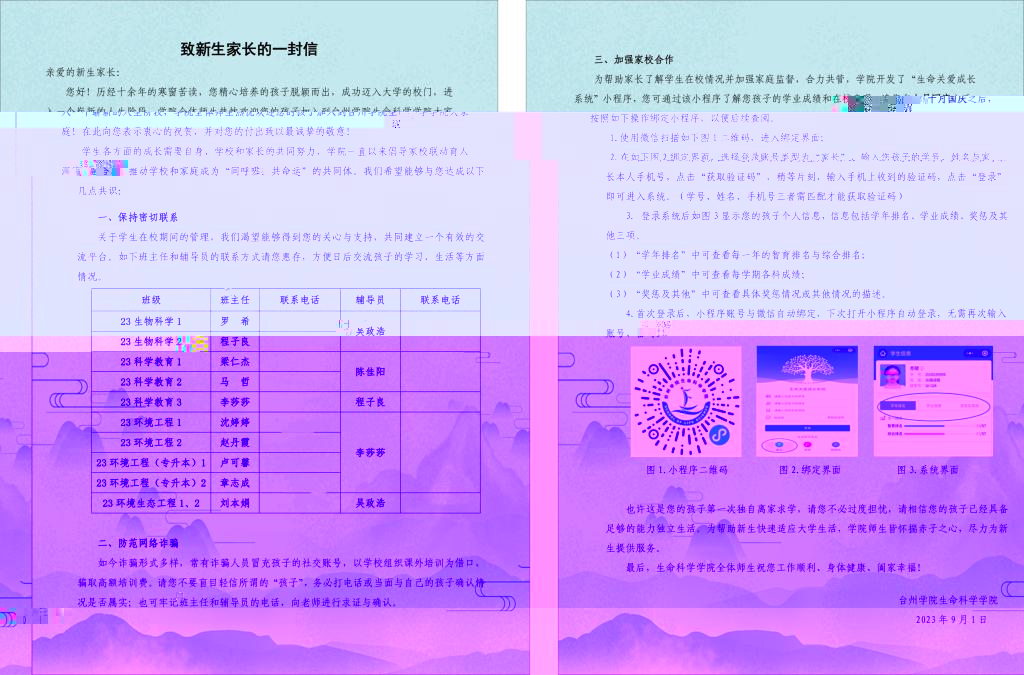 一紙書信連兩地。為保持家校密切聯系,學院為每一位新生家長送上一封“家書”。信中寫有班主任、輔導員的聯系方式,送上防範網絡電信詐騙攻略,并附上學院專門開發的“生命關愛成長系統”小程序使用說明,方便家長關注孩子的學業成績和在校表現。